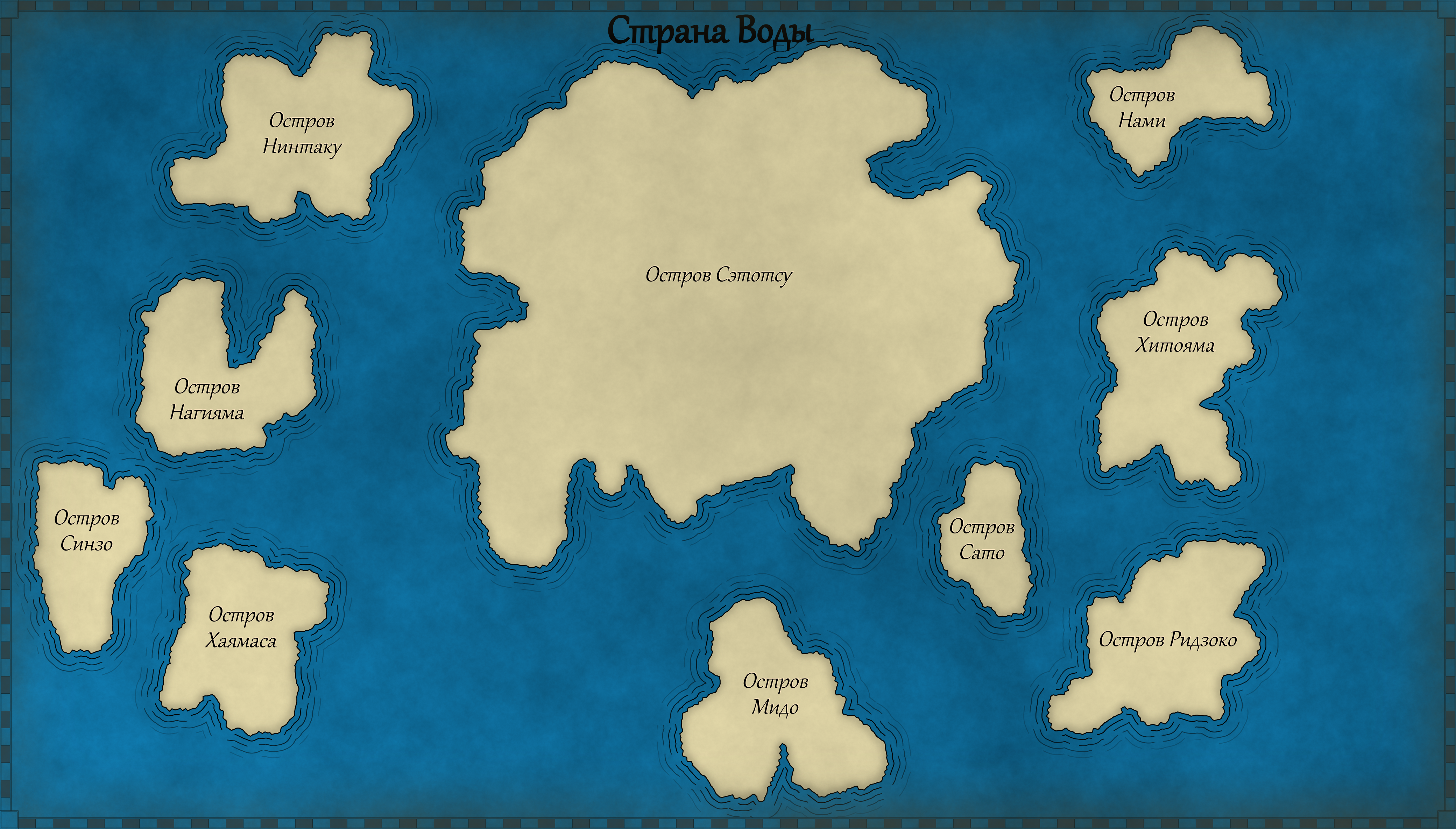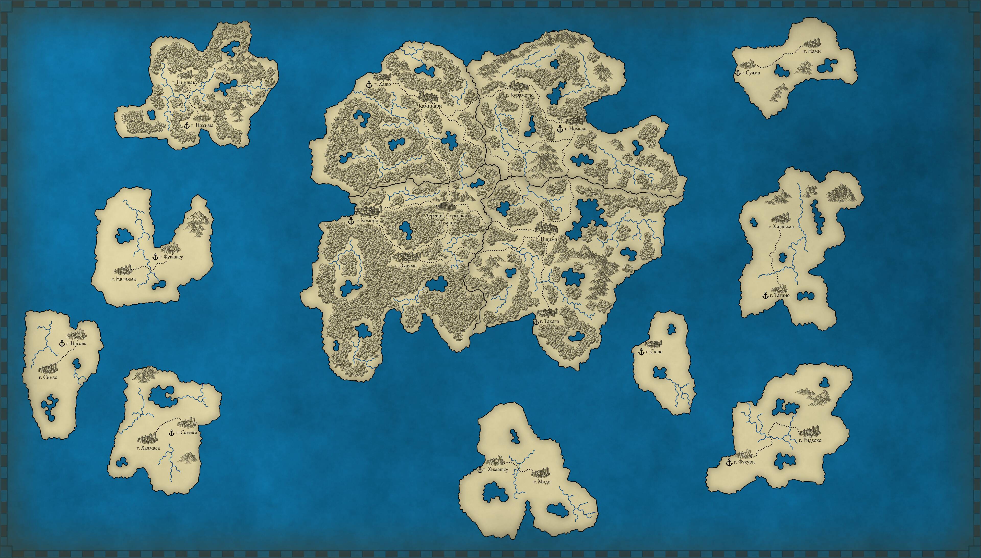- Немного обновлена подробная карта страны Воды. Добавлены несколько портовых городов, основные дороги между ними и административными центрами префекторий, а также озера, реки, горы и лесные массивы (последние пока что только на островах Сэтотсу и Нинтаку).